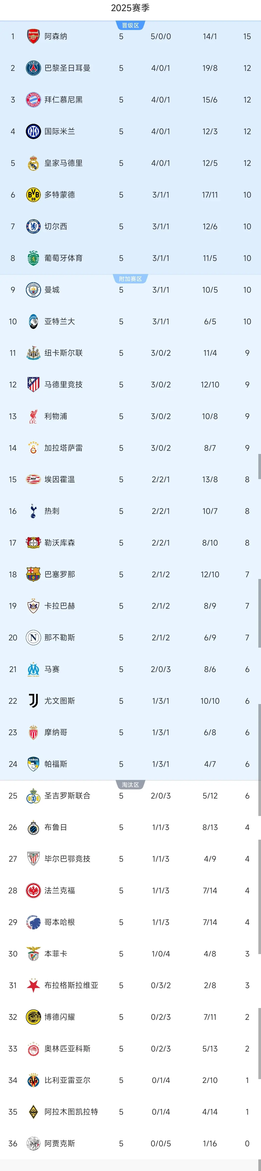 随着皇马4-3险胜,欧冠联赛最新积分榜如下,国米1-2被绝杀遭遇首场失利,另外一场焦点战阿森纳3-1力克拜仁,赢下榜首之战,五连胜的豪华战绩成功登顶。