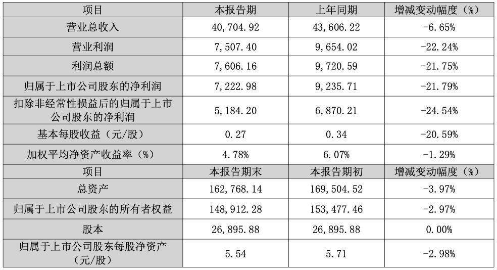 本报告期末,总资产162,768.14万元,较本报告期初下降3.97%;归属于上市公司股东的所有者权益148,912.28万元,较本报告期初下降2.97%;归属于上市公司股东的每股净资产5.54元,较本报告期初下降2.98%。