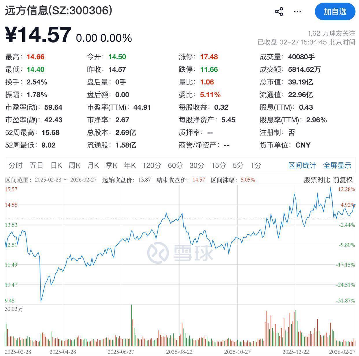 二级市场上,截至2月27日收盘,远方信息报14.57元/股,总市值为39.19亿元。